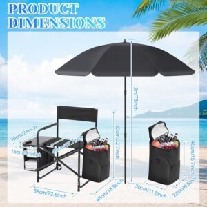Package Includes: you will receive a black steel frame camping chair with side table, cooler pouch and detachable parasol , the size of the chair is about 18.9 x 22.8 x 32.7 inch, loading capacity is about 220 lbs, thickened steel frame structure, offering stability and durability experience