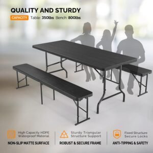 Quality and Sturdy: This 6ft long table and bench three-piece set is made with high capacity HDPE waterproof material, ensuring durability and stability. The tree patterned surface make it beautiful as well as stable .The non-slip matte surface provides a secure grip, and the sturdy triangular structure support and robust metal frame offer added strength. The fixed structure secure locks and anti-tipping safety design further enhance stability and safety