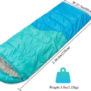 Roomy and Lightweight:The size of the sleeping bag is 86.6 x 31.5 inches(220 x 80 cm).Pack weight is about 3.3lbs.It could be fully opened to be a blanket for picnic or play.Convenient to carry along for any outdoor adventures with the carry bag
